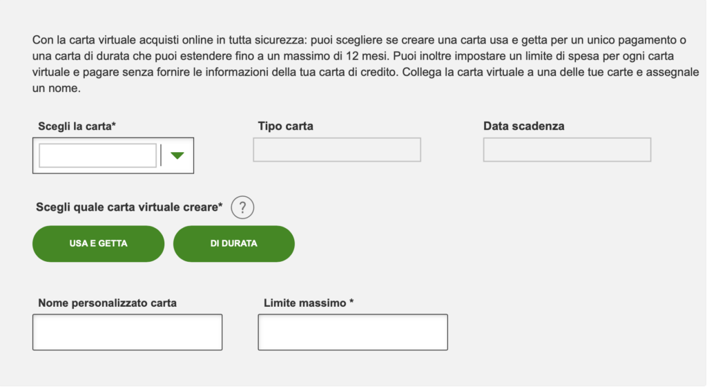- Carte virtuali di durata: sono carte che durano nel tempo e che puoi usare più volte per i tuoi pagamenti online. Puoi impostare una data di scadenza e una soglia massima di spesa per avere maggior controllo e sicurezza.