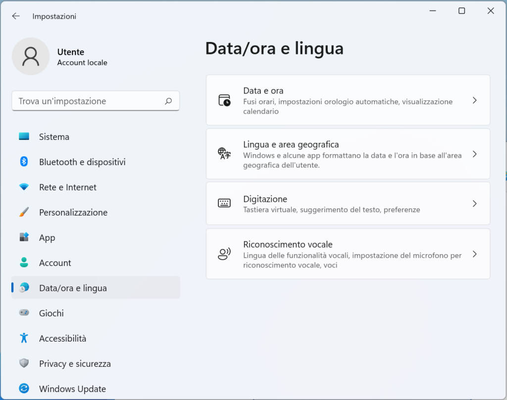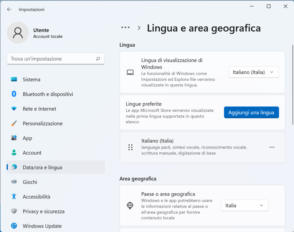 - Nel pannello di destra cliccare su “Lingua e area geografica”. Si apriranno le lingue installate sul vostro PC.