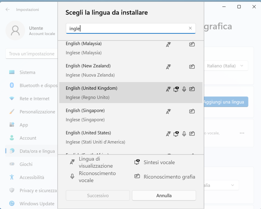 - Cercare la lingua Inglese (potete scegliere tra Inglese Regno Unito o Inglese Stati Uniti d’America) e premete su Successivo. Seguite le istruzioni a schermo e installate i pacchetti lingua che vi suggerisce.